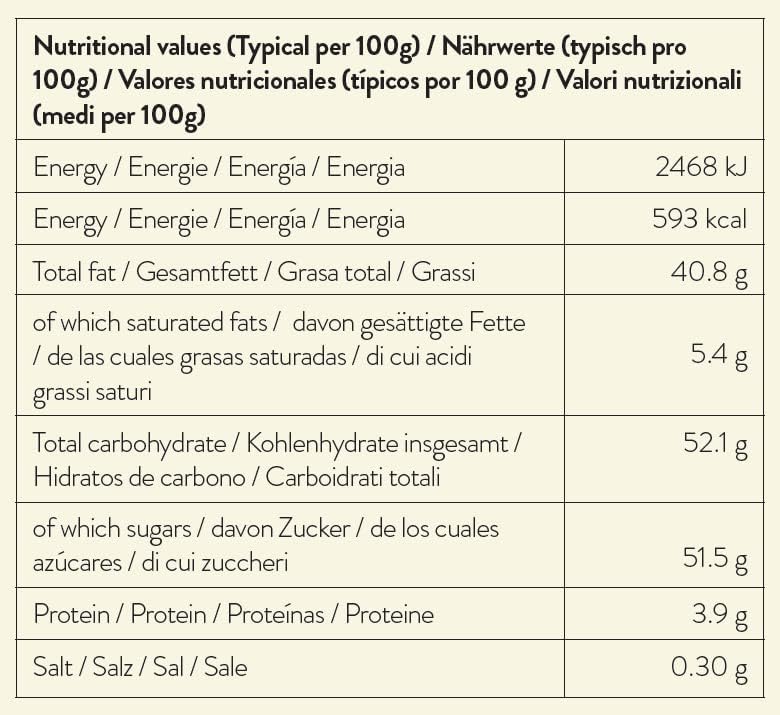 Ingredients: Sugar, Vegetable fats (Sunflower, Cocoa butter), Skimmed milk powder, Pistachios (5 %), Milk whey powder, lactose, Emulsifier: Soy lecithin, Flavours, Salt, Colours: E141i, Beta carotene